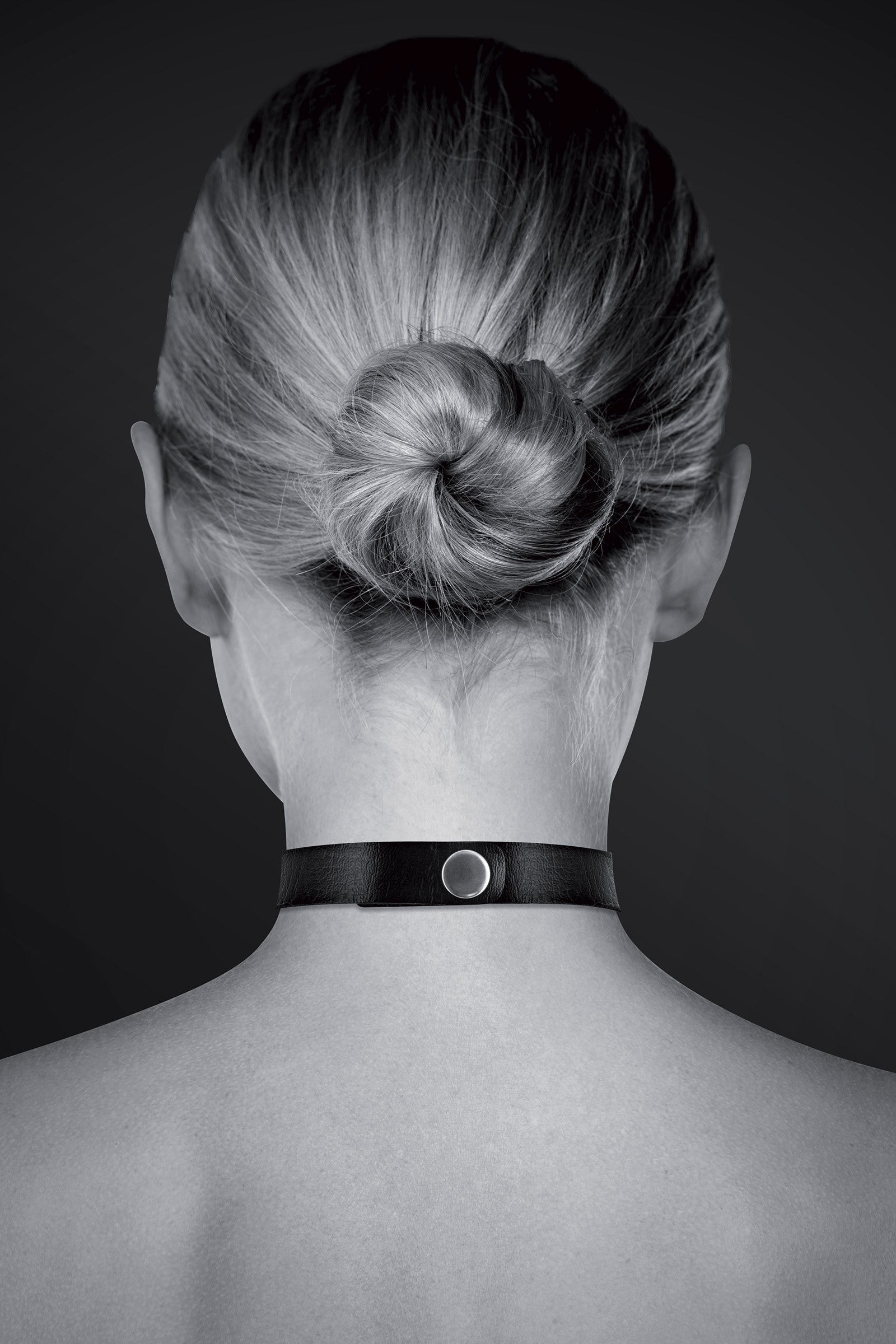 Un collier en simili cuir noir, fabriqué en polyuréthane, qui invite aux jeux BDSM. En effet, le double anneau en métal argenté permet d'attacher en laisse la soumise qui le porte. Le collier d'une longueur de 40 cm est réglable grâce à une fermeture à pression à plusieurs crans. Ce ras de cou peut également dissimuler la démarcation du col montant des poitrines en silicone, ou encore votre pomme d'Adam.