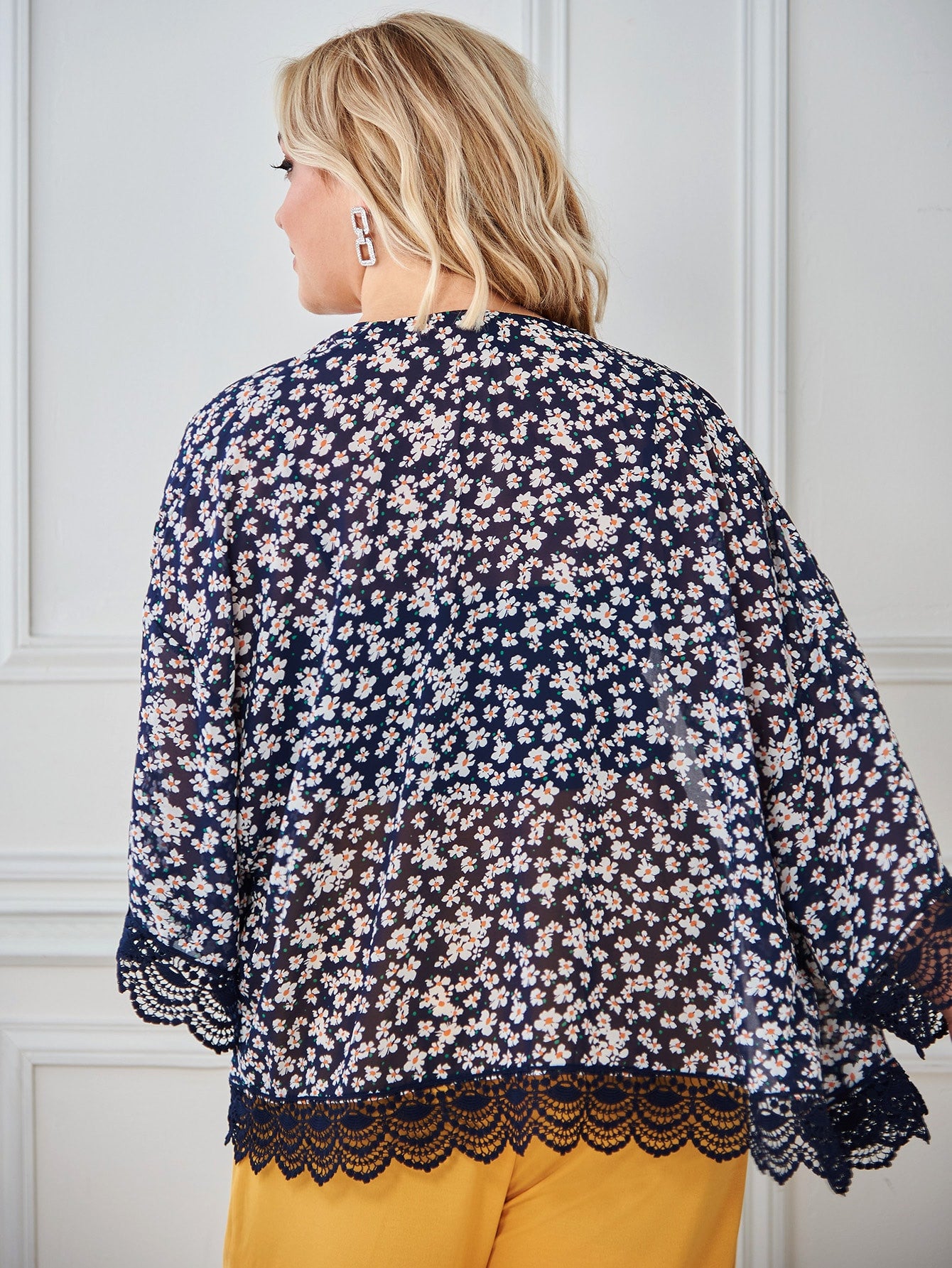 C'est un gilet large et fluide, qui prend la forme d'un kimono. Des fleurs blanches sont imprimées sur un fond bleu marine, ce qui les met en valeur. Une dentelle noire borde le kimono. Il est disponible en grande taille.