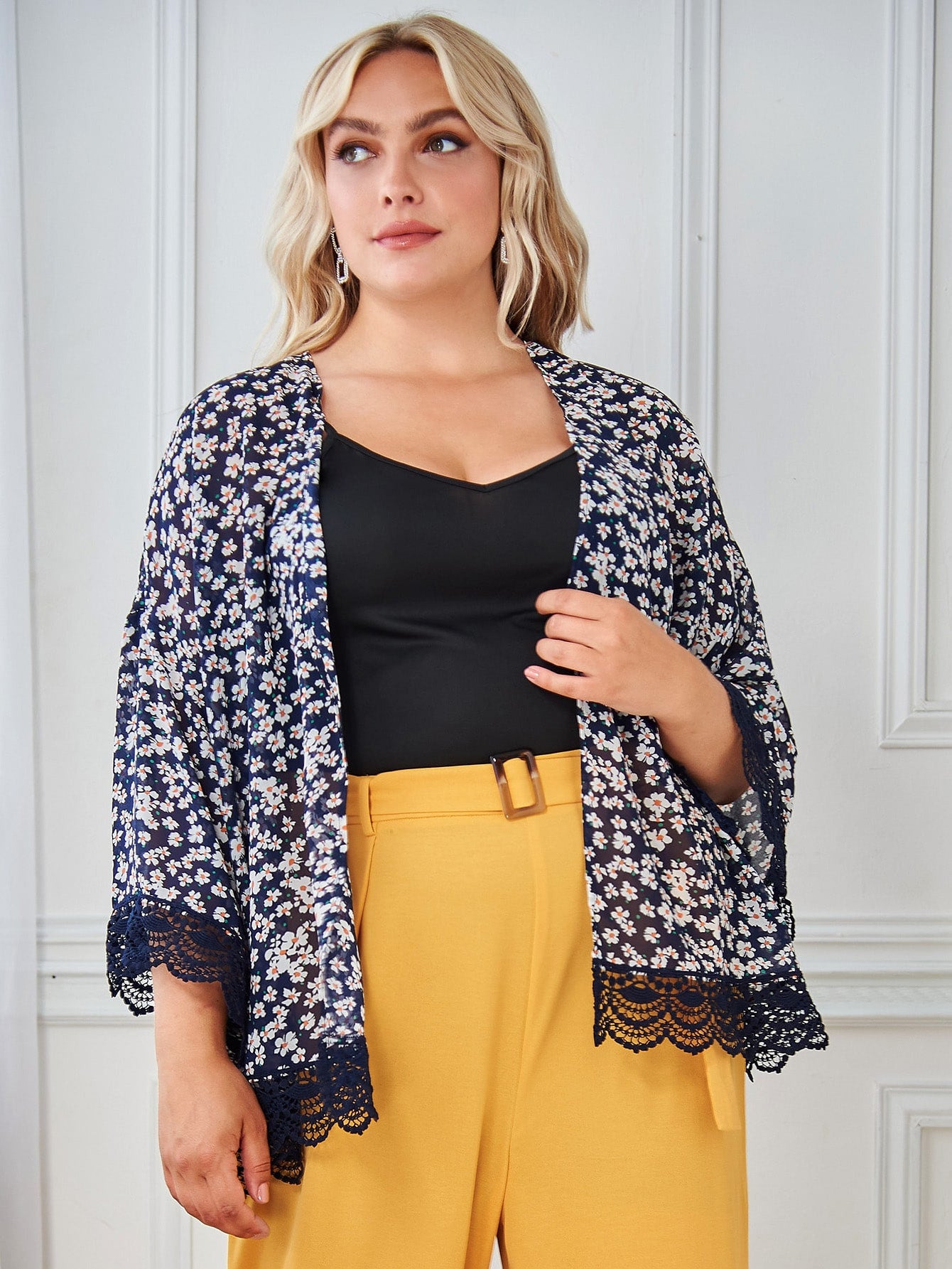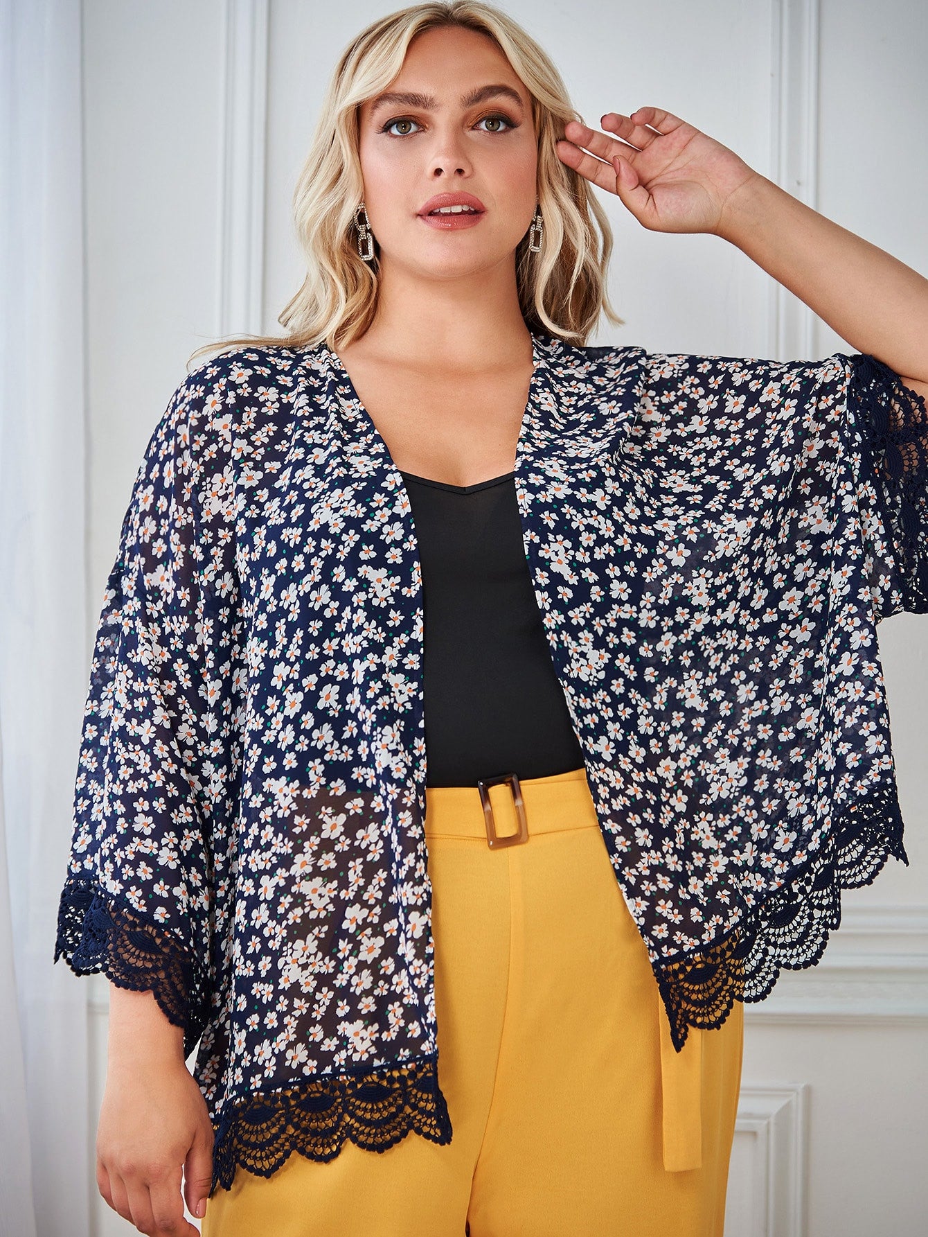 Kimono à fleurs, grande taille, bleu - SHEIN