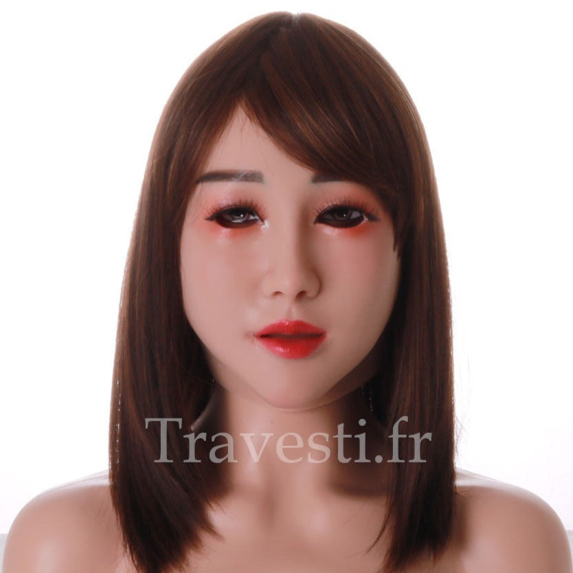 Le masque Angela est maquillé de façon permanente. Au niveau des yeux, des fards à paupières dans les tons pêche ont été appliqués. Une touche de lumière dans le coin interne de l'œil agrandit votre regard. Une paire de faux cils ainsi qu'un trait d'eyeliner noir dessinent la forme des yeux. Les lèvres sont également maquillées avec du rouge à lèvres brillant. Sur les joues, le blush rehausse les pommettes.