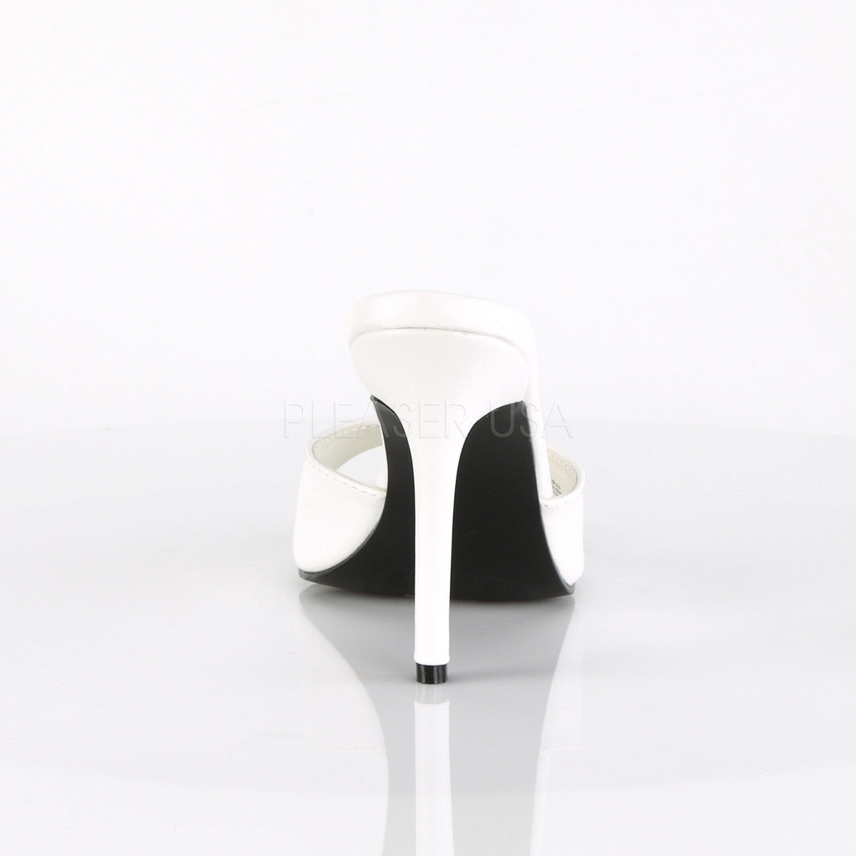 Les chaussures Classique-01 en blanc mat sont des mules sans plateforme de la marque Pleaser à talons aiguilles. Cette élégante paire de mules est montée sur des talons aiguilles de 10,2 cm. Leur large ouverture à l'avant de la chaussure convient parfaitement aux pieds larges et les rend très confortables.
