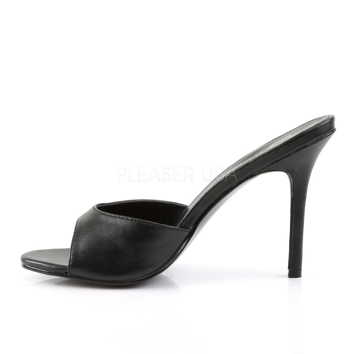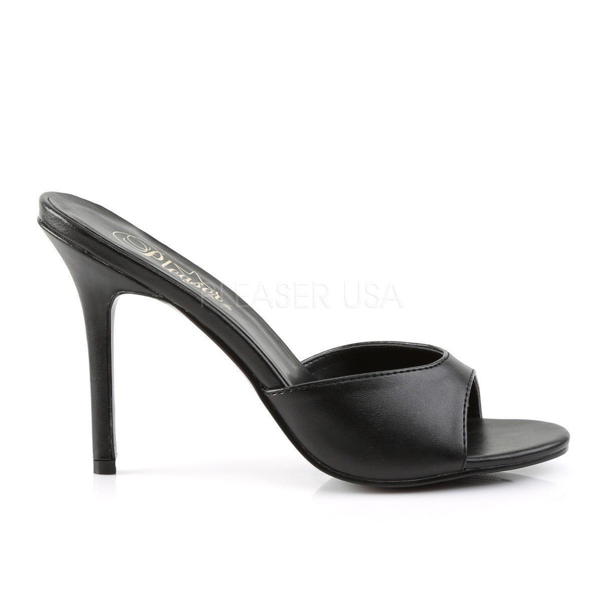 Les chaussures Classique-01 en noir mat sont des mules sans plateforme de la marque Pleaser à talons aiguilles. Cette élégante paire de mules est montée sur des talons aiguilles de 10,2 cm. Leur large ouverture à l'avant de la chaussure convient parfaitement aux pieds larges et les rend très confortables.