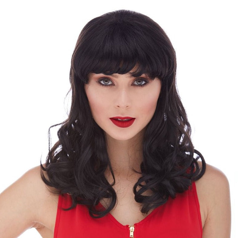 Catherine est une perruque mi-longue en noir de la marque Sepia en cheveux synthétiques idéale pour quiconque souhaiterait se donner un style pin-up. Ses cheveux ondulés tombent au-delà des épaules. Quant à la frange longue, il est possible de la coiffer au choix sur le côté ou droite.