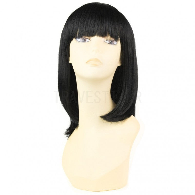 La perruque Dara de la marque Mane Muse en noir est une perruque mi-longue en cheveux synthétiques. Elle a de beaux cheveux lisses qui tombent aux épaules et une belle frange coupée bien droite. C'est une perruque très facile à coiffer. Dara est faite en fibres synthétiques qui résistent à la chaleur, ce qui en fait une perruque aux possibilités de coiffures illimitées avec un lisseur ou un fer à boucler.