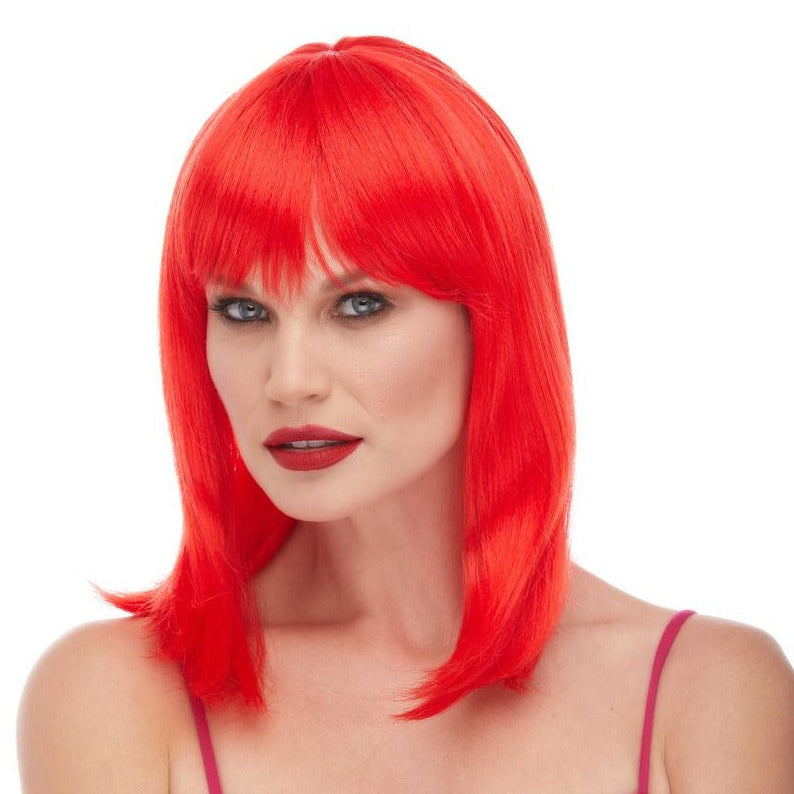Doll est une perruque mi-longue en rouge de la marque Characters en cheveux synthétiques qui peut convenir à de nombreux déguisements, car il en existe des déclinaisons très colorées. Avec son carré plongeant et sa frange droite très graphique, Doll est une coiffure très facile à coiffer.
