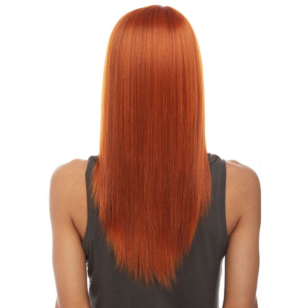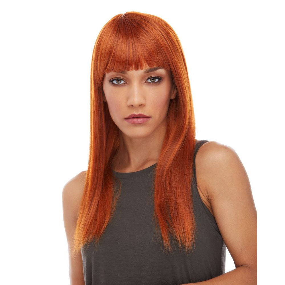 La perruque Hailey dispose de longs cheveux synthétiques. Sa coupe se caractérise par sa frange droite ainsi que ses longs cheveux effilés. Son teint cuivré lui donne beaucoup de brillance. Par ailleurs, il s'agit d'une perruque heat safe que l'on peut coiffer selon ses préférences.