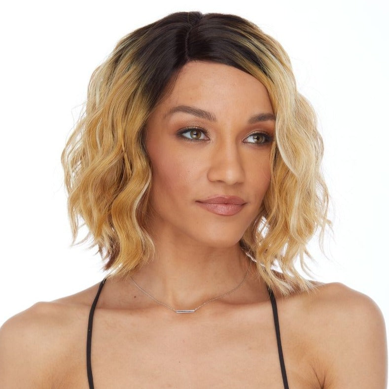 Honey est une perruque aux cheveux synthétiques mi-longs de la marque Sepia. Elle se caractérise par ses cheveux ondulés à hauteur des épaules. Ce modèle possède des racines noires et des mèches blondes. Il s'agit d'une perruque à la fois lace front pour plus de réalisme, et heat safe pour plus de créativité.