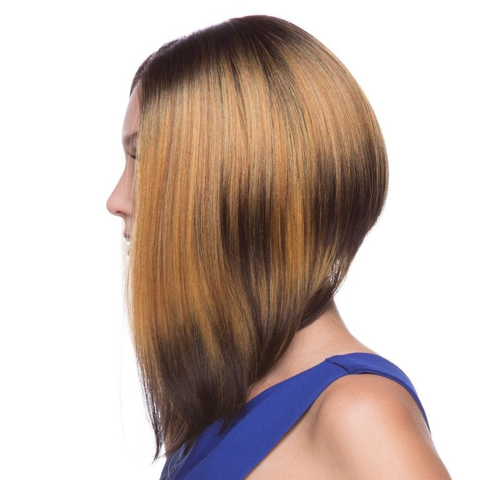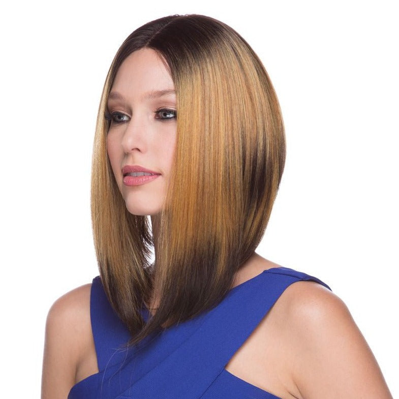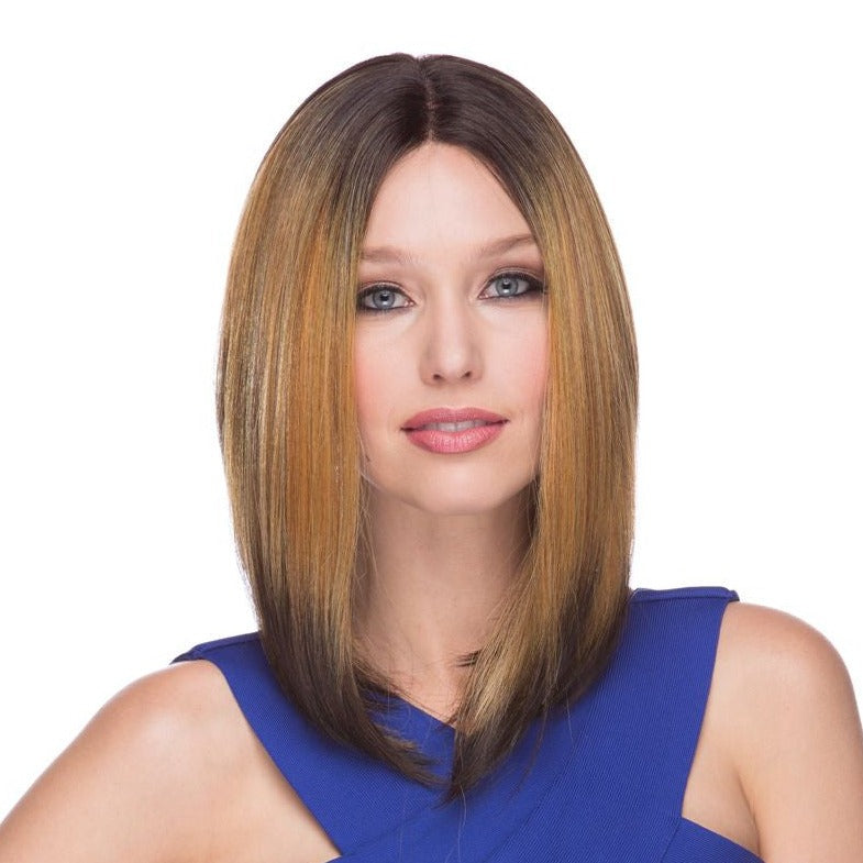 La perruque Libby en châtain de la marque Sepia est une perruque mi-longue aux cheveux lisses coupée en carré plongeant, c'est-à-dire qu'elle est plus courte à l'arrière que devant. Il s'agit d'une perruque lace front, dite invisible, ce qui lui donne un aspect plus naturel et plus réaliste. La frange est dégagée pour mettre en valeur la féminité du visage. La perruque Libby est une perruque facile à coiffer puisque ses cheveux sont lisses.