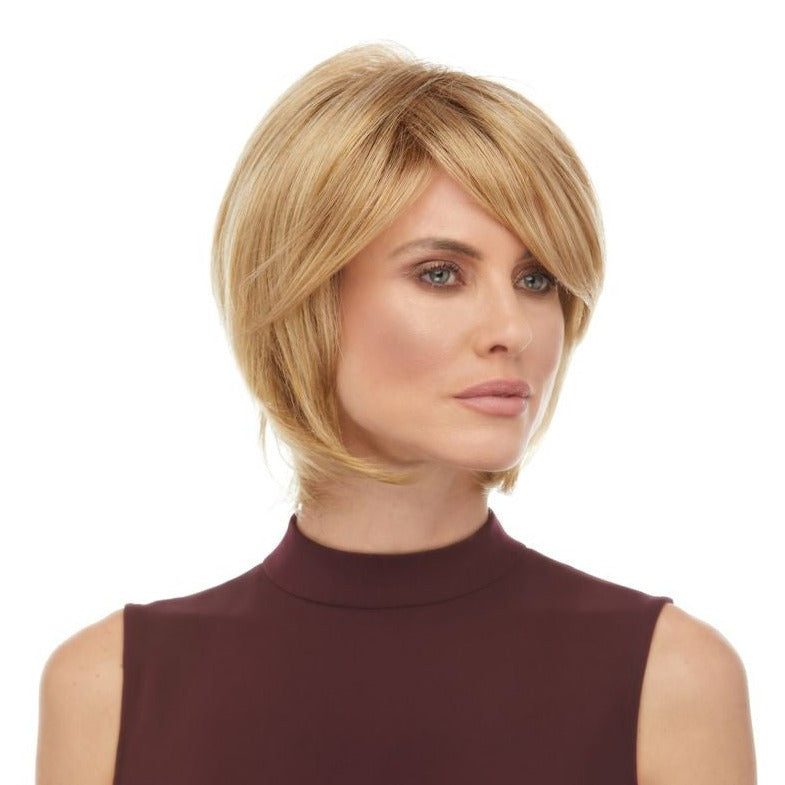 La perruque Raquel couleur blond miel de la marque Euronext est une perruque courte avec un dégradé en cheveux synthétiques. Avec ses cheveux lisses qui rebiquent très légèrement et sa large frange coiffée sur le côté, Raquel est une perruque qui a beaucoup de mouvement et qui donne une allure jeune. Il s'agit d'une perruque très facile à coiffer.
