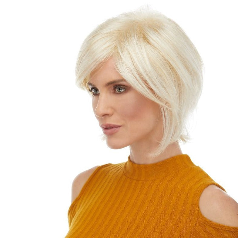 La perruque Raquel en blond platine de la marque Euronext est une perruque courte avec un dégradé en cheveux synthétiques. Avec ses cheveux lisses qui rebiquent très légèrement et sa large frange coiffée sur le côté, Raquel est une perruque qui a beaucoup de mouvement et qui donne une allure jeune. Il s'agit d'une perruque très facile à coiffer.
