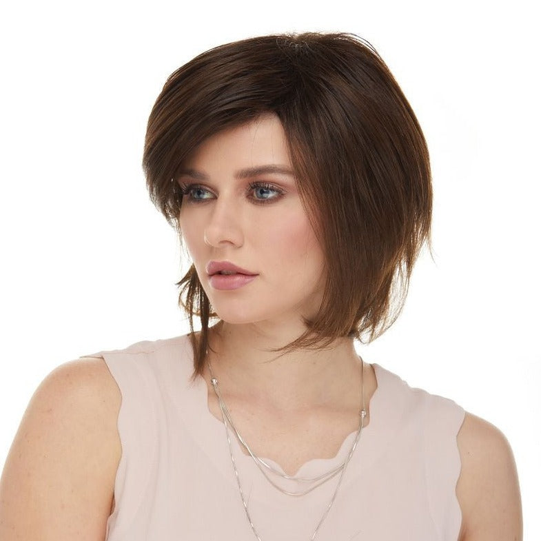 La perruque Raquel en brun de la marque Euronext est une perruque courte avec un dégradé en cheveux synthétiques. Avec ses cheveux lisses qui rebiquent très légèrement et sa large frange coiffée sur le côté, Raquel est une perruque qui a beaucoup de mouvement et qui donne une allure jeune. Il s'agit d'une perruque très facile à coiffer.