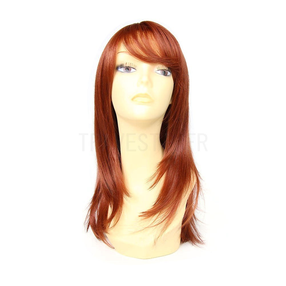 La perruque Romantic de la marque Sepia en cuivré est une perruque mi-longue en cheveux synthétiques. Elle est plus large que la majorité des perruques, ce qui la rend très agréable à porter pour les clientes qui ont beaucoup de cheveux ou un crâne large. Sa frange coiffée sur le côté et ses cheveux ondulés vers l'intérieur donnent beaucoup de mouvement. Romantic est faite en fibres synthétiques qui résistent à la chaleur, ce qui en fait une perruque aux possibilités de coiffures illimitées avec un lisseur ou un fer à boucler.