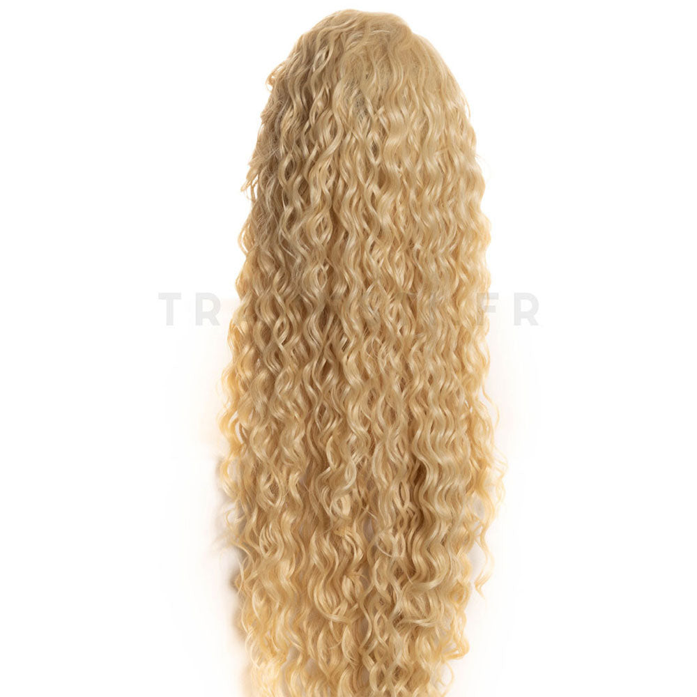 La perruque Symphony en blond platine de la marque Sepia est une très longue perruque aux cheveux frisés qui tombent jusqu'aux fesses. Il s'agit d'une perruque lace front, dite invisible, ce qui lui donne un aspect plus naturel et plus réaliste. La frange lissée est coiffée sur le côté, donnant du mouvement à la coiffure.