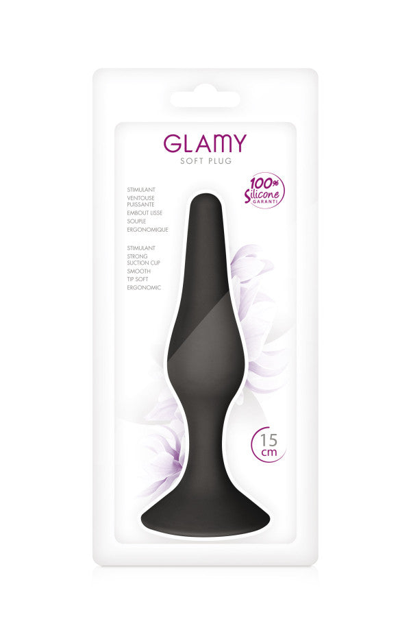 Le plug anal noir de la marque Glamy est un plug doux entièrement en silicone. D'une longueur de 15 cm, le plug est muni d'une ventouse puissante. Son embout lisse et ergonomique convient parfaitement aux expériences anales.