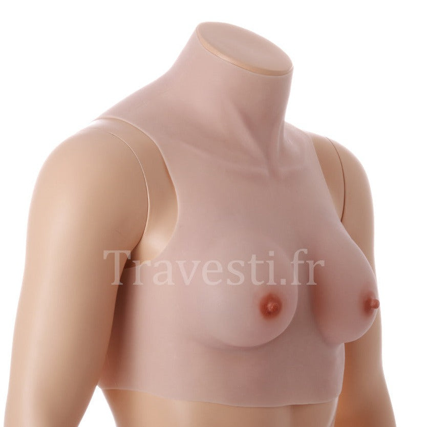 Poitrine réaliste en silicone alimentaire destinée à toutes les femmes trans qui rêvent d'un magnifique décolleté. Le col montant de ce modèle peut être dissimulé à l'aide d'un ras-de-cou. Il s'arrête juste au-dessous la poitrine et ne possède pas de manches. Il ne dispose pas de fermeture éclair et s'enfile en tirant dessus, ce qui lui donne un aspect plus réaliste. Les seins sont remplis de coton élastique ou de silicone pour un poids et une physique plus réalistes. La poitrine est disponible en trois coloris pour s'accorder à votre couleur de peau naturelle. La taille des seins de ce modèle correspond à un bonnet A et son teint est très clair.