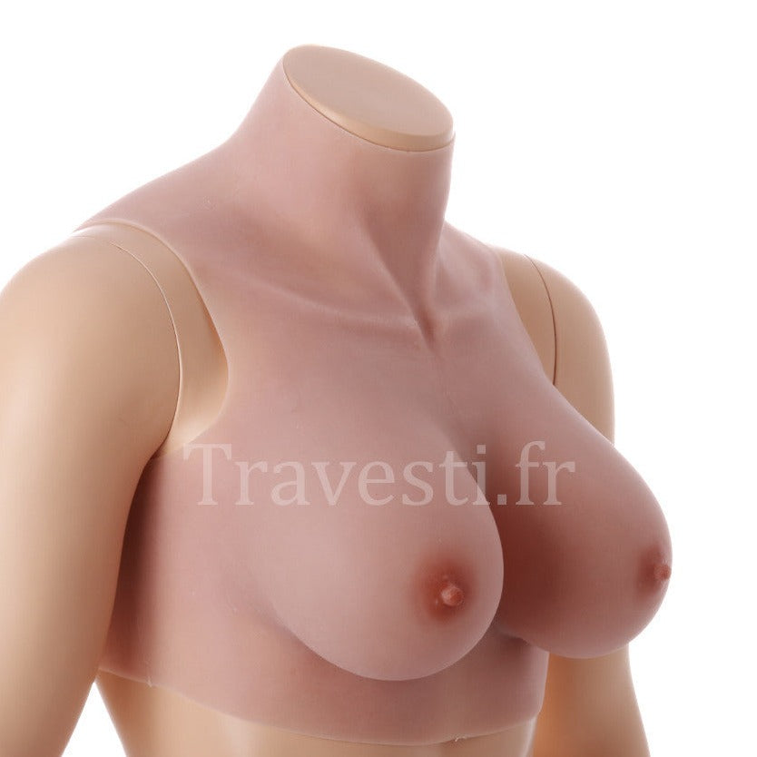 Poitrine réaliste en silicone alimentaire destinée à toutes les femmes trans qui rêvent d'un magnifique décolleté. Le col montant de ce modèle peut être dissimulé à l'aide d'un ras-de-cou. Il s'arrête juste au-dessous la poitrine et ne possède pas de manches. Il ne dispose pas de fermeture éclair et s'enfile en tirant dessus, ce qui lui donne un aspect plus réaliste. Les seins sont remplis de coton élastique ou de silicone pour un poids et une physique plus réalistes. La poitrine est disponible en trois coloris pour s'accorder à votre couleur de peau naturelle. La taille des seins de ce modèle correspond à un bonnet E et à un teint clair.